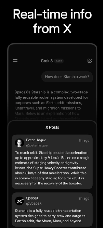 Grok的移动端同样提供了两种使用方式。一种是Grok的独立App,另一种是通过X App登录后进入Grok互动界面。