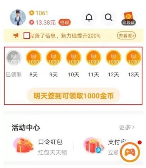 5. 通过签到与领取金币来赚钱。在任务板块进行签到能够积攒金币,连续签到的话,所获金币数量会逐步增加。在首页右上角有一个标着‘领’字的红包,点击进入就能获取相当数量的金币。