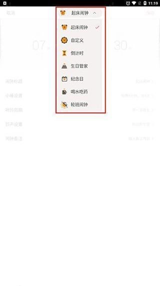 2. 点击顶部中间位置,即可选择闹钟的类型。