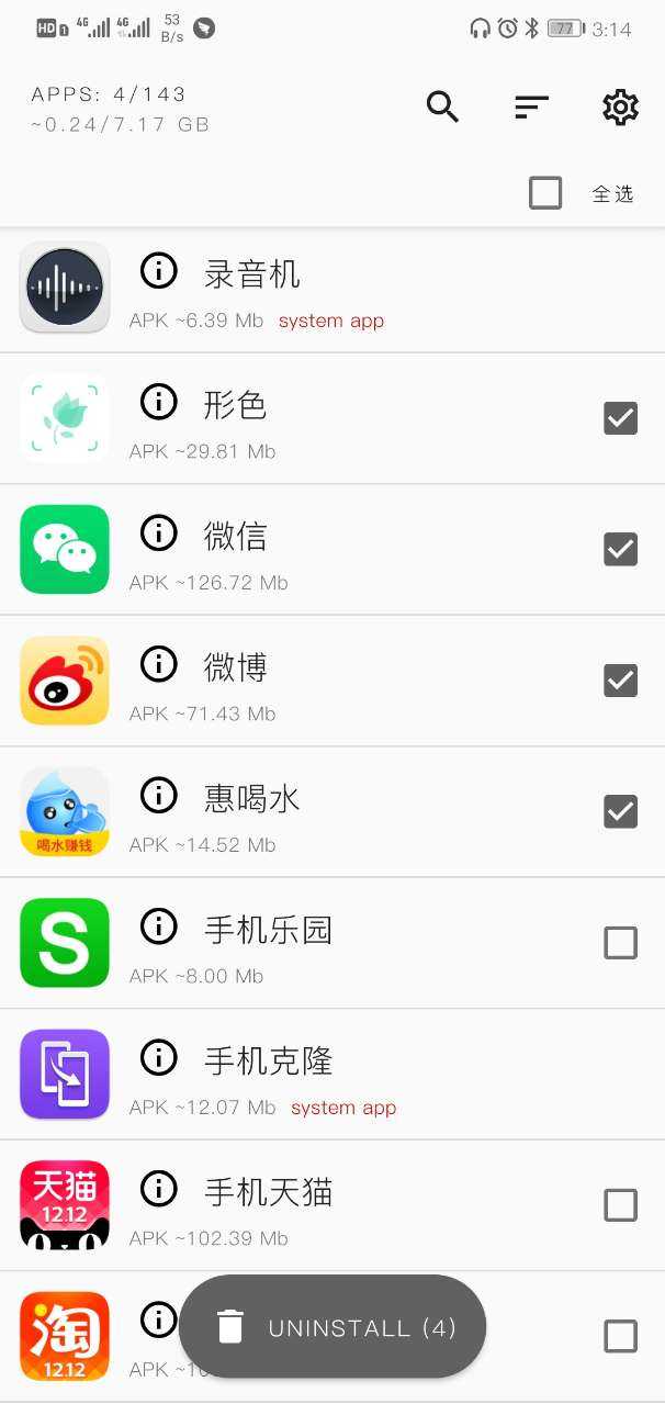 2、进入之后,你手机里的所有应用程序都会展示在此处,自行勾选就可以了。