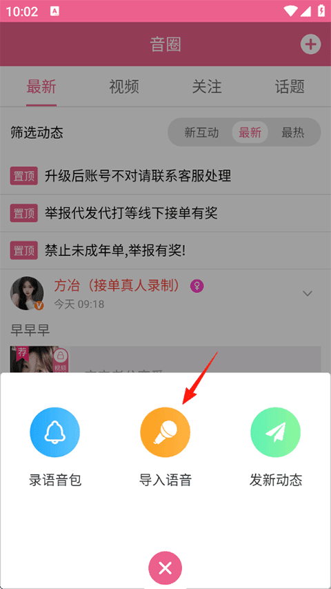 3、或者在首页点击发布作品,在弹出的列表中选择导入语音条。