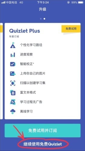 3、完成注册后,系统会自动弹出一个升级会员的页面,对此无需理会,直接点击页面最下方的“继续使用免费Quizlet”即可。