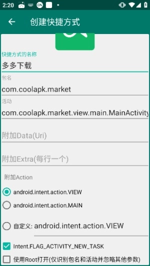 4、此外,诸如快捷方式名称、包名、活动、附加action等各项内容,我们同样能够自定义切换。