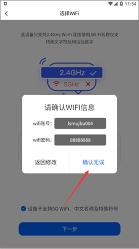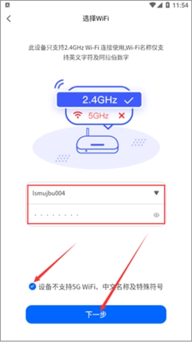 2、接下来,挑选设备所连接的WiFi,输入准确的密码后,点击“下一步”。