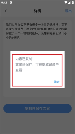 7、随后会弹出一个提示框,显示复制成功,且已自动保存为文案,你能够在提取记录里进行查看。