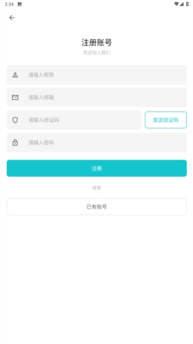 3、于注册页面内填入昵称、邮箱以及验证码,即可完成注册。