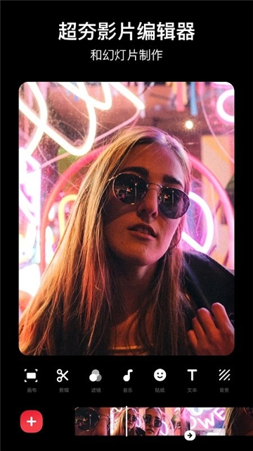3、首先,我们点击视频并导入一个视频,接着进入视频编辑页面,此时便能够对视频进行剪切、调速,还可以添加背景、滤镜、音乐、文字、贴纸等操作。