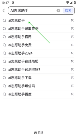 1、打开百度,在搜索栏输入“AI志愿助手”,随后在弹出的下拉选项中点击【AI志愿助手】。