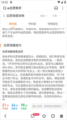 1、根据你的分数和个人情况,智能匹配适合的高校,全面推荐一些冲刺院校、适中院校、甚至保底院校,绝对让你选择不再纠结。