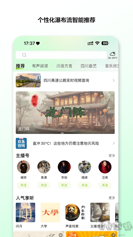 熊猫享听,专为四川人民打造的音乐电台播放软件。它提供了丰富多样的电台类型,任用户自由挑选。软件操作简便,还为用户准备了海量音乐资源。你不仅能收藏喜爱的音乐,还可以关注心仪的电台主播。此外,软件拥有大量具有四川特色的电台内容,让你全面了解四川最新的各类新闻资讯,是众多用户青睐的四川电台在线收听软件。