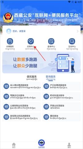1、完成登录后,在首页最先点击【应用中心】,通过这个入口,你能快速找到需办理的事项。