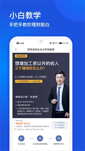 1、这是一款手机软件,能让用户实时在线学习各类不同的理财课程。