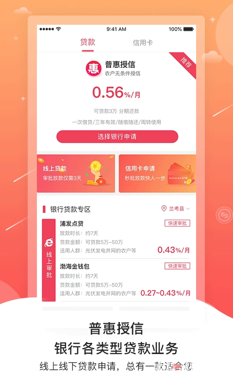 1、【普惠授信】呈现合作银行面向农村的惠农、扶农授信产品。
