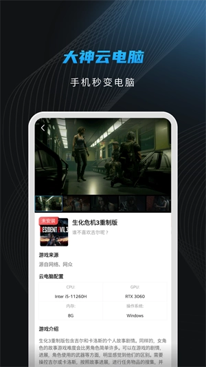 大神云电脑,这是一个完全免费的云电脑平台哦。在这里,用户能够在手机上毫无卡顿地畅玩多款经典的电脑游戏大作,而且不存在任何性能方面的限制,只要轻轻一点就能开始游戏,根本无需排队等待。不仅如此,大神云电脑还具备游戏云存档功能,同时也支持邀请好友一同组队开黑。要是你对此感兴趣,那就快来大神云电脑体验一番吧!