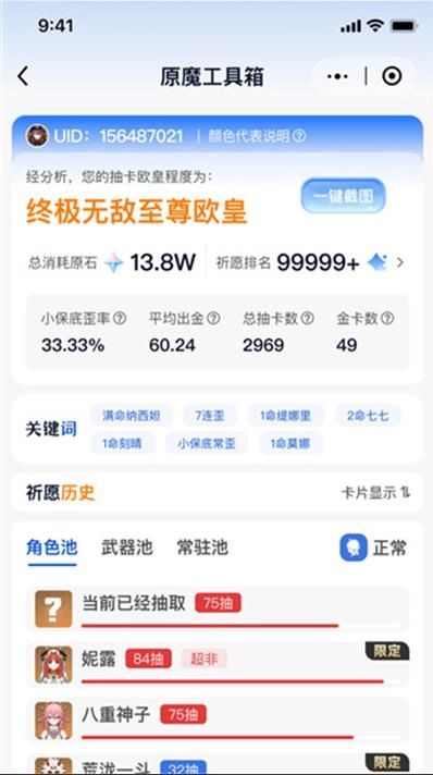 原魔工具箱,堪称一款实力强劲的原神辅助利器。它涵盖抽卡查询、角色攻略、原神图鉴以及养成分析等诸多实用功能,能为玩家带来海量游戏干货助力。玩家仅需凭借原神 UID 绑定自身账号,即可畅享原魔工具箱的全部功能。其中抽卡查询功能,能让你清晰知晓自己的欧气指数。此外,该工具箱界面设计简约清晰,操作便捷轻松上手。感兴趣的朋友,赶紧来体验一番吧!