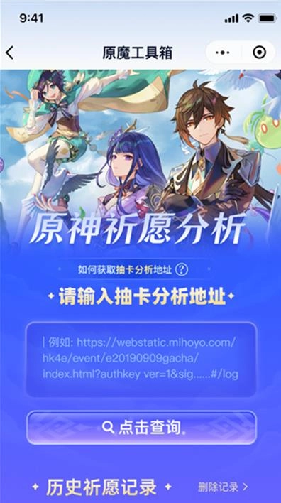 3、于主页点击抽卡查询,进入抽卡查询界面。抽卡链接获取方式,可参照原魔工具箱公众号的教程,不过小编更推荐通过原神link获取,在本站搜索即可。