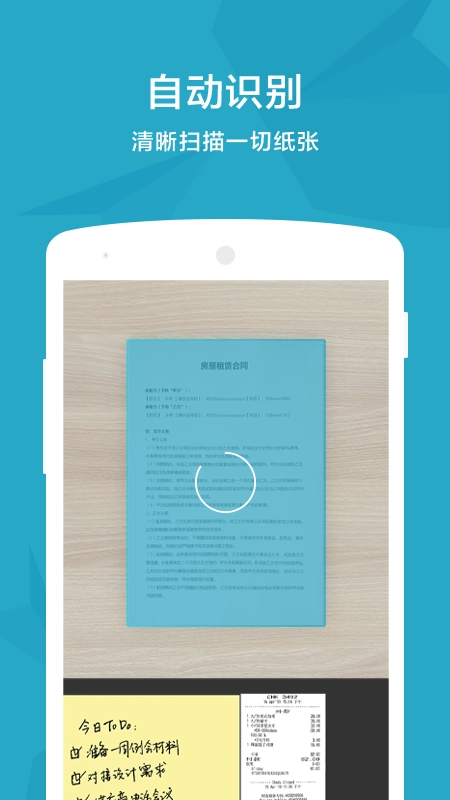 文档扫描功能:通过智能识别文档,生成扫描件并以pdf格式呈现,同时支持分享与导出。