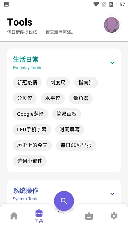 包含刻度尺、指南针、水平仪、量角器,以及诸如Google翻译、短网址生成之类的工具。