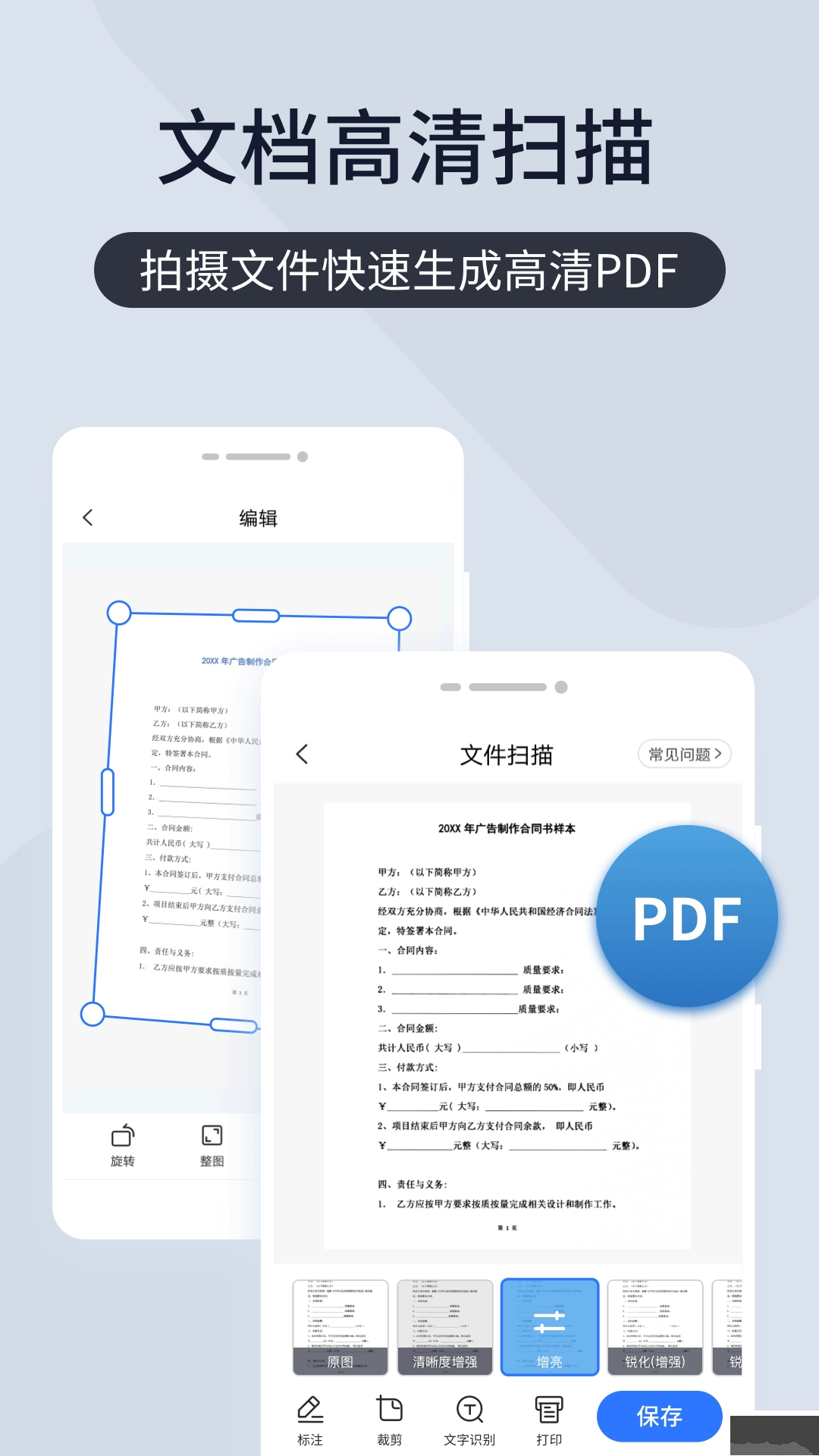 * 能够对单张文件、多张文件或书籍进行高清扫描,迅速生成PDF扫描件,且可对扫描件的色彩、亮度等进行调整。