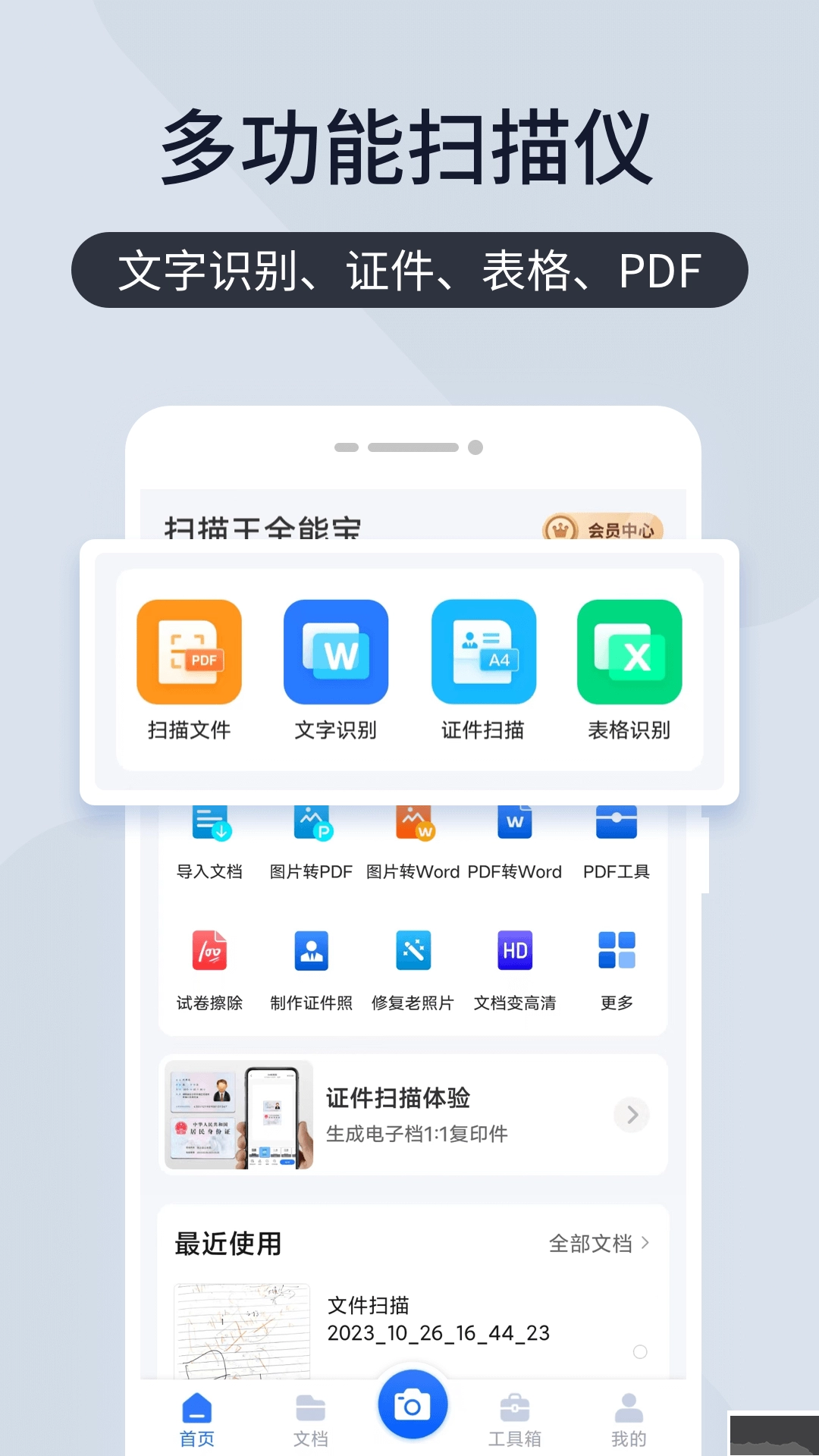 当用户进入本站并打开软件后,若希望进行文件扫描或识别操作,可在首页点击上方的扫描文件、文字识别、证件扫描、表格识别等选项,从而快速实现文件识别。