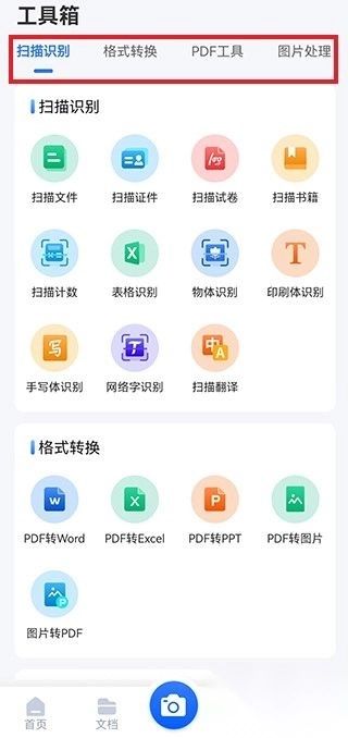 若用户希望使用更多功能,点击下方的工具箱即可。在工具箱页面,设有扫描识别、格式转换、PDF工具、图片处理这四大工具分类。每个分类下都有众多功能可供选择使用,能够满足用户多样化的功能需求。