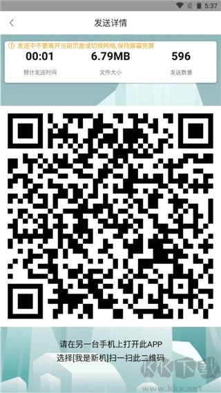 3、点击之后,便会进入发送界面。该发送界面上有一个二维码,紧接着在新手机上打开互传换机助手。