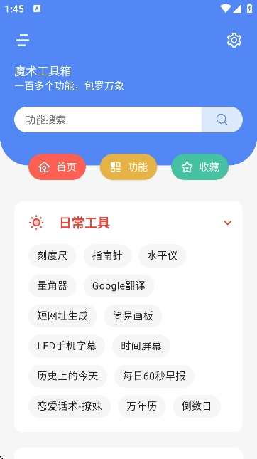 魔术工具箱软件拥有丰富多样的实用功能模块。在这款软件里,你能够进行网盘搜索、资源嗅探、短视频去除水印,还能浏览图片壁纸、设置个人头像。不仅如此,软件配备了计算工具、图片工具、文字工具、系统工具以及其他各类工具。日常生活中,无论是量长度、测水平、量角度,还是进行进制转换等,都能在魔术工具箱软件里找到相应工具轻松解决。它真的十分实用,有需求的小伙伴们,赶紧来试试魔术工具箱软件吧!