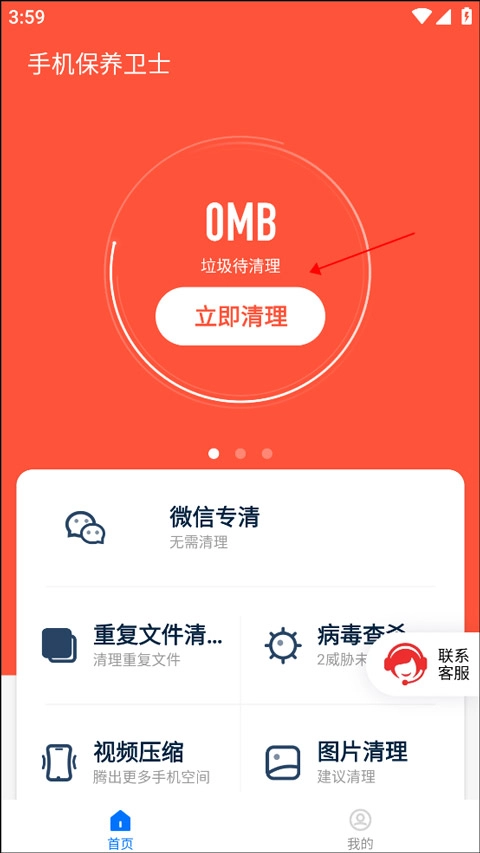 1. 首次进入软件主界面时,点击“垃圾清理”选项,对手机内存垃圾及结存垃圾展开扫描。