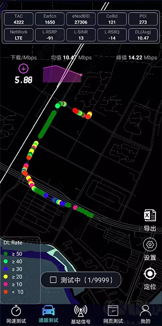 5、第二项功能为道路测试。无论您是在车内,还是步行过程中,该功能都能对沿途的信号强度进行测试,并通过颜色在地图上予以标注。测试结束后,还可导出表格文件,便于后续进行数据处理。