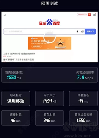 --网页测速:开展网页深度测试,聚焦网页访问的真实感受,针对网页响应时间、加载时延、加载速度等各项指标予以评测。评测得出的结果反映的是当前网络运营商与网站提供商的整体性能状况。