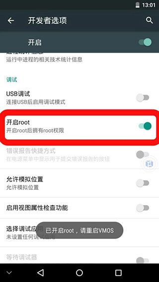 4、寻找到root开关,便能进行开启或关闭操作,随后依据提示重新启动VMOS。