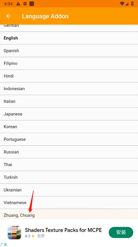 3、继续拖到最下面选择中文,如下图所示,选择简体中文。