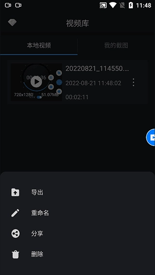 4、录制完毕的视频以及录制过程中的截图,均会在视频库页面呈现,你能够自由导出、重命名,也能一键分享。