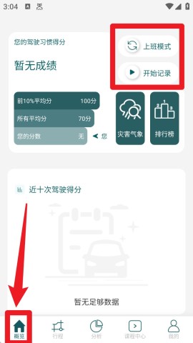 3、成功登录后,首页会呈现驾驶评分以及记录入口,点击“上班模式”就能开启驾驶行为的记录。