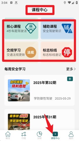 5、轻点“课程中心”,即可进入学习模块,在此你能够自由挑选核心课程、标志标线以及交通法规展开学习。