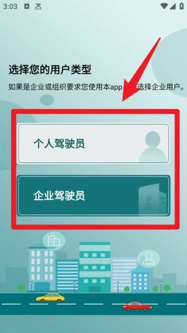 1. 打开应用后,挑选用户类型。若是个人司机,就选择“个人驾驶员”;要是企业内部用车,则选择“企业驾驶员” 。