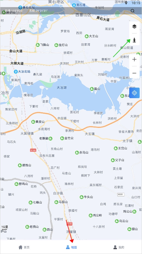 5、除上述方式外,用户也能够回到首页,借助底部导航栏把页面切换到【地图】位置(即下图红色箭头指示区域),在打开的页面里,点击右侧工具栏中类似人物的图标(也就是下图绿色箭头指示区域)