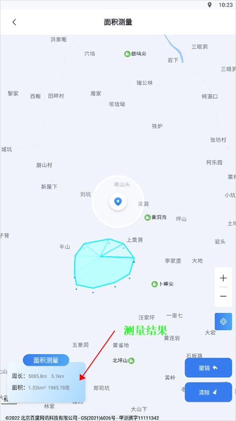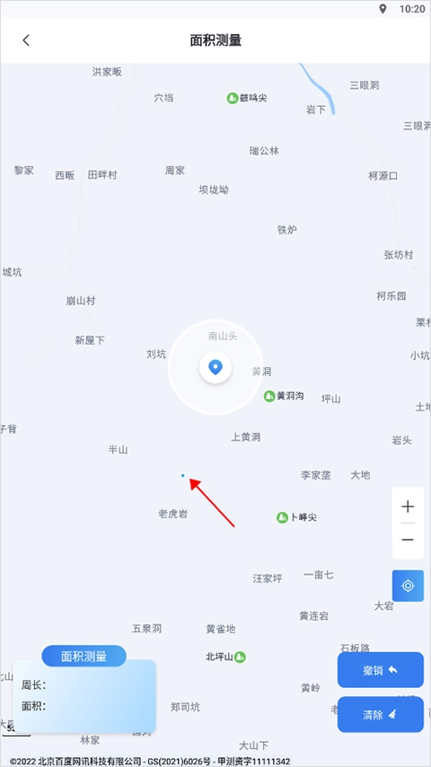 2、软件能够借助用户手机定位功能,自动精准定位到用户的实际所在位置。用户仅需在想要测量面积的区域,点击确定一个中心点(即下图红色箭头所指向的小蓝点)。