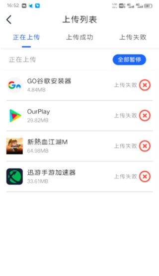 接着便可以上传你想要上传的游戏或应用啦。上传时,最好处于WiFi环境,如此网络会更为稳定,而且也不会耗费过多流量。