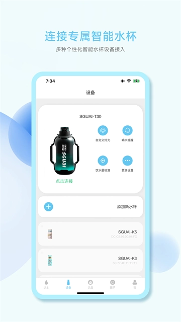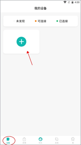 1、打开软件后自动进入到“饮水”界面,跳转到“设备”这个模块后,点击上方的加号图标