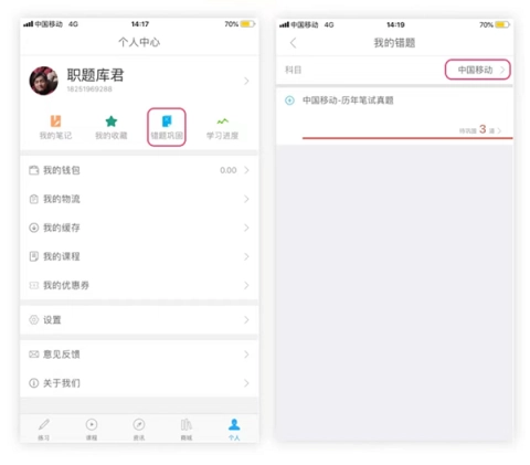 1. 错题的巩固练习仅能在与之对应的科目(公司或岗位)内开展,比如:中国移动的错题要在中国移动科目下查看。