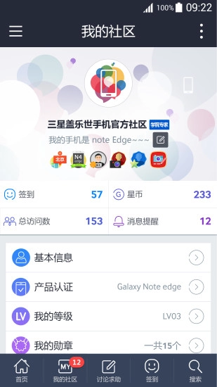 4、点击进入“我社区”,在这里能够查看签到、星币、消息提醒、基本信息、产品认证等内容。