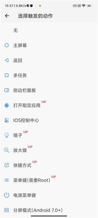 3、挑选该动作所触发的功能,涵盖返回、镜子、放大镜以及快捷方式等。