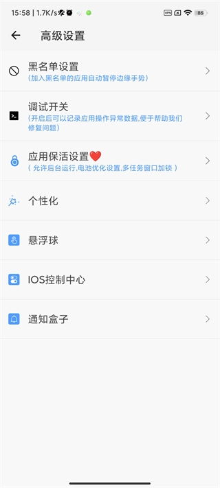 一旦添加了黑名单,边缘手势、悬浮球以及顶部手势等将自动暂停。