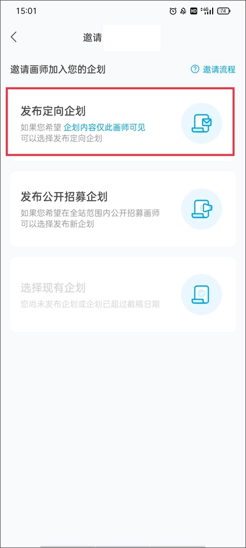 3、如果你想要请画师进入你的企划当中,可以点击邀请按钮,根据你的需求来选择是定向企划还是公开招募企划。