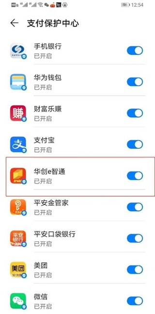 打开“支付保护中心”,于该界面中寻得“华创e智通”,把它后面的开关条关闭就行。如图所示。