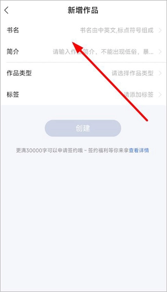 2. 在作品页面依次填入书名、简介、作品类型以及标签,随后点击“创建”。