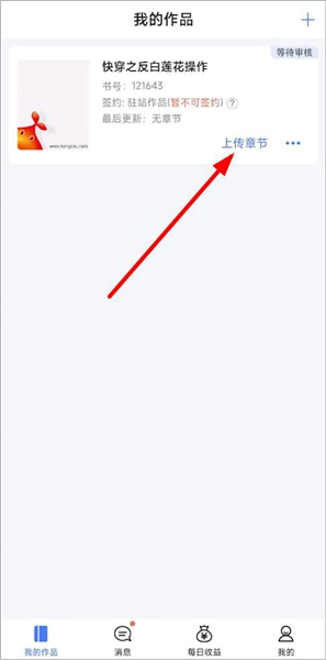 3、提交作品信息后即进入审核阶段,在“我的作品”页面能够查看已创建的作品,点击作品下方的“上传章节”选项。