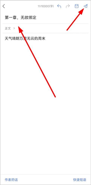4、在相应位置输入章节名称以及正文内容,接着点击页面右上角的纸飞机标志,就能上传文章内容。待审核通过后,便可发布作品。