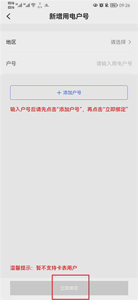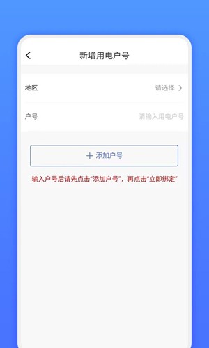 3、请依据实际情形,挑选与之对应的地区,接着输入用电户号,最后点击“立即绑定”便可。